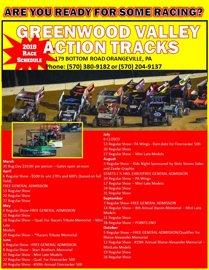 Greenwood Valley Action Tracks (GVAT) is located at 179 Bottom Road, Orangeville, PA 17859. Phone (570) 380-9182. It is a family owned, 1/5 mile banked dirt oval with some of the best open wheel racing you will see in the area. The track is family friendly and offers on site concessions with a full menu, handicap parking, a lighted track, great views of the races and on-site bathrooms. Go karts, micro racing each week March-October.