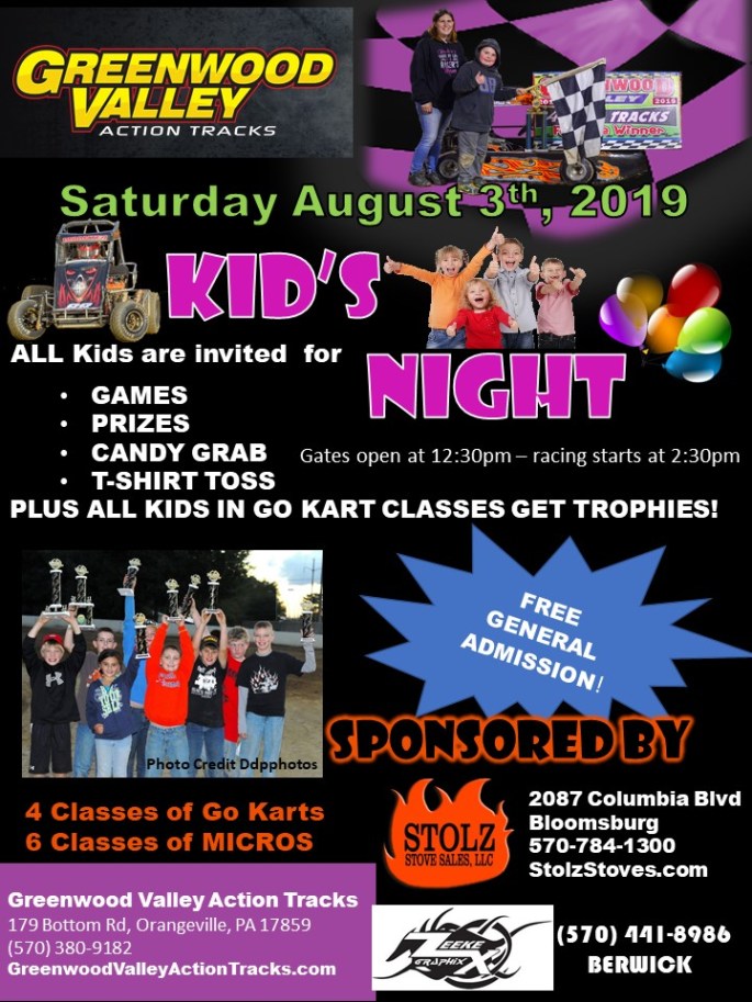 Orangeville, PA: Greenwood Valley Action Tracks, Columbia County’s premier dirt track speedway, will host their 8th annual Kid’s Night on Saturday August 3rd. The night will feature free general admission to the grandstands (pit passes are $20 for anyone over 4 years old), a candy grab for all kids, and games like a water balloon toss and frisbee challenge with prizes for the winners. Spectators in the grandstands will be invited onto the track at intermission, between the go kart and micro programs, to take part in the kid’s events. Racing that night will include the regular line-up of 4 go kart and 6 micro sprint classes. Gates will open at 12:30pm, go kart warm-ups start at 2:30pm. Kid’s Night is sponsored by Stolz Stoves in Bloomsburg and Zeeke Graphix in Berwick.