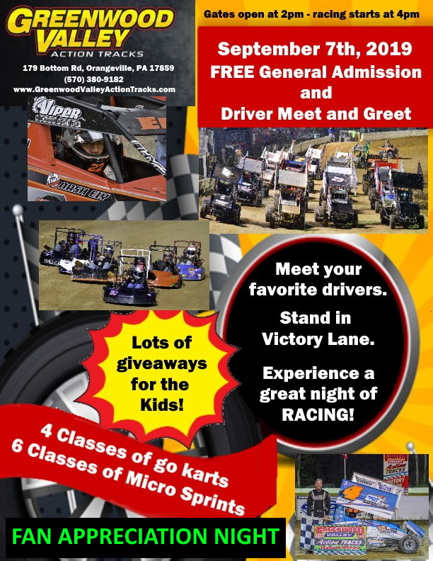 Come see what all the excitement is about! Greenwood Valley Action Track is the home to the most exciting and entertaining races in our area. The track is family friendly and offers on site concessions with a full menu, handicap parking, a lighted track, great views of the races and on site bathrooms. Free general admission to the grandstands for Fan Appreciation Night! Go karts, micro racing each week. On September 7th we will hold a driver meet and greet where you can get out on the track, meet your favorite drivers, get up close to the cars, stand in victory lane, and score some great swag! Racing, door prizes and great food! All this and FREE general admission!